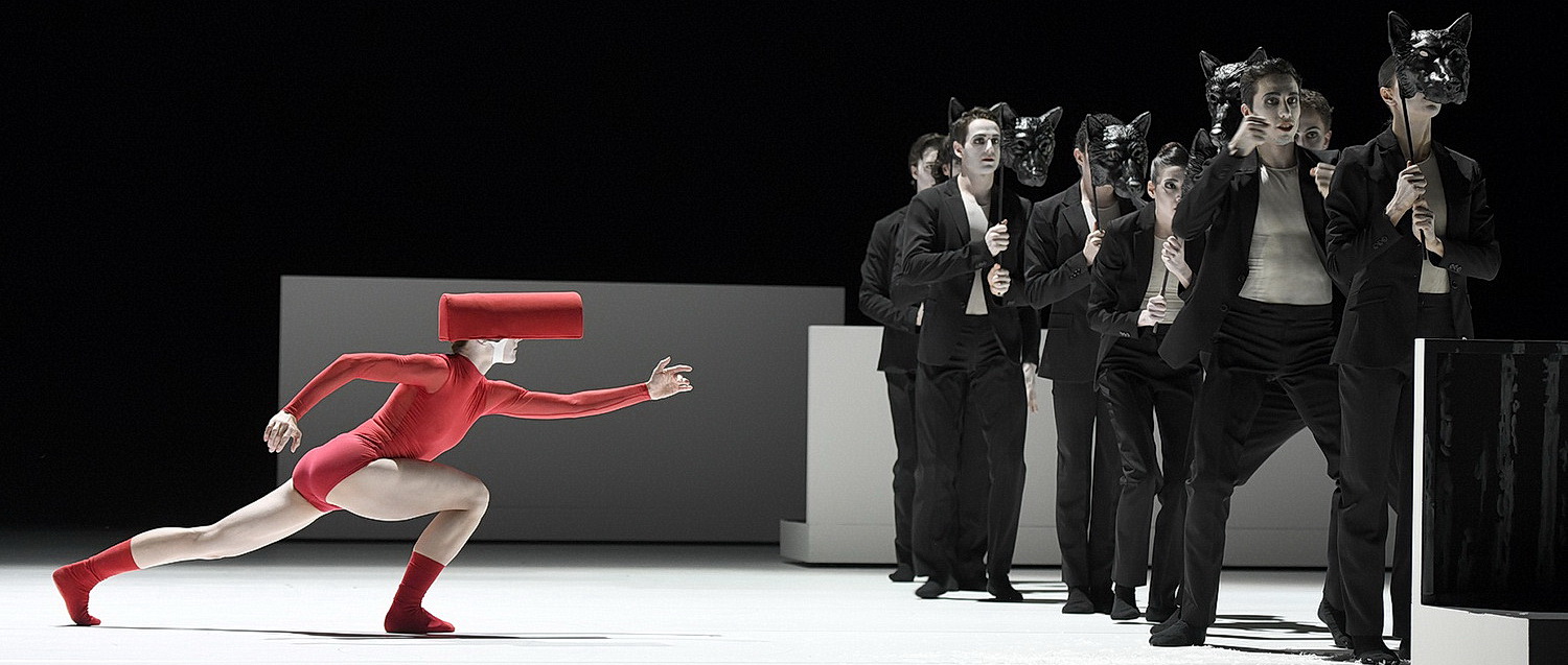 Douglas Lee will kein Handlungsballett, will keine Geschichten auf der Bühne erzählen, sondern das Publikum emotional erreichen. Diese Sprüche kennen wir von anderen Choreografen, die dann lieber einen Schwanensee verhunzen, anstatt sich die Gedanken zu machen, die Lee zu einem Höhepunkt des modernen Balletts verleitet haben. In She wore red – Sie trug Rot – erzählt Lee nicht die Geschichte vom Rotkäppchen der Gebrüder Grimm nach, sondern findet ein Szenario, das die Zuschauer tatsächlich noch einmal anders berührt. Auf der Bühne, die er ebenso selbst entwickelt hat wie die Kostüme, finden sich mobile Versatzstücke, die nicht nur das Licht von Bonnie Beecher gekonnt reflektieren, sondern auch für eine im Wortsinne fantastische Choreografie sorgen, die zwischen Verstecken immer wieder neue Situationen bewirkt, in der die Figuren auf sich selbst oder gar nur auf Ausschnitte ihrer selbst reduziert werden. Dazu wählt Lee eine Bewegungssprache, die an Flexidolls erinnert, lebende Puppen. Jelena-Ana Stupar schreitet im roten Kostüm, zunächst mit einer Kopfbedeckung, die ihre Sichtbehinderung erklärt, über eine Bühne, die zwar spärlich ausgeleuchtet ist, aber nur deshalb, weil sie tatsächlich etwas zu verbergen hat. Die relevante Handlung liegt im gleißenden Spot. Nichts, was wesentlich ist, bleibt geheim. Auch so kann man leuchten. Das Wolfsmotiv bleibt erst mit Handmasken, dann figural im Vordergrund. Und Sae Tamura gibt eine beeindruckende Großmutter ab. Lee hat dazu die Musik von Bernard Herrmann ausgewählt. Ein Musiker, der viele Filme von Alfred Hitchcock vertont hat. Und Kenner werden darin die Musik Outer Space Suite erkennen, die für einen Science-Fiction-Film in den 1950-er Jahren komponiert wurde. Alle anderen lassen sich einfach so von der Musik, in der die Streicher im Vordergrund bleiben, beeindrucken.