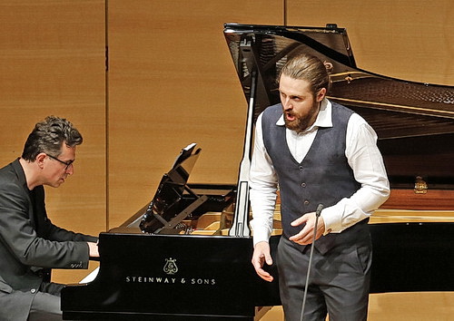 Und Krimmel? Er trumpft gegenüber Samstag in Verbindung mit dem inspi­rie­renden Pianisten noch einmal auf. Seine schnör­kellose, kernige Bariton­stimme hat klare Höhen bis in die Tenorlage hinein, kann aber auch auf eine fundierte Tiefe bauen. Mit kluger Agogik, teils nachgebend, teils fordernd, gelingt ihm ein Vortrag mit absolut natür­licher Tongebung und Betonung. Die Phrase­n­enden werden immer abgefangen, man versteht nahezu jedes Wort. Dabei kann er auch Erotik in der Stimme zeigen, bei einem Bariton, der am Natio­nal­theater  München nächstes Jahr den Don Giovanni singen wird, unabdingbar. Unglaublich viele Farben stehen ihm zur Verfügung, seine „Silbertöne“ im Ständchen vergisst man so schnell nicht. Am Ende, in Der Atlas, sieht man förmlich, wie er das Gewicht des Felsens, den „Schmerz der Welt“ auf seinen Schultern trägt.