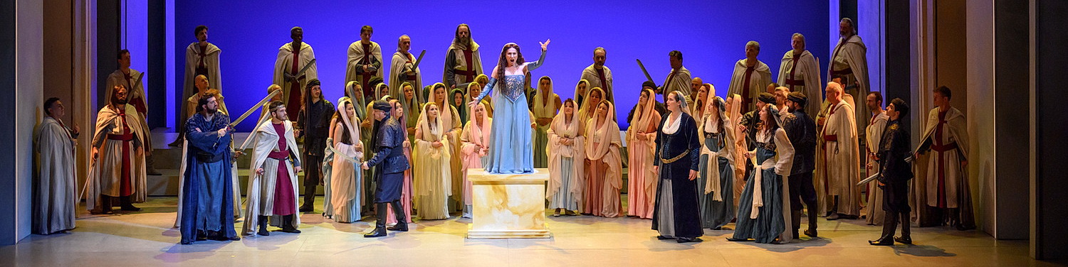 In der Tat erwartet die Besucher der dreistün­digen Aufführung packendes Musik­theater, auch wenn die enormen vokalen Ansprüche selbst die Lütticher Oper an ihre Grenzen führen und den ideolo­gi­schen Problemen des Stücks in der Insze­nierung von Sarah Schinasi geschickt ausge­wichen wird. Mit I Lombardi alla Prima Crociata – Die Lombarden auf ihrem ersten Kreuzzug – setzte Verdi 1843 seine Erfolgs­serie unmit­telbar nach dem durch­schla­genden Triumph des Nabucco fort. Verständlich, dass er für die Lombardi ein ähnliches, bewährtes Sujet wählte und die effekt­vollen musika­li­schen Ingre­di­enzien übernahm. Im Fahrwasser der italie­ni­schen Unabhän­gig­keits­be­wegung kam damals auch die Befreiung Jerusalems von der saraze­ni­schen Herrschaft gut an. Das Problem: Während der Kampf des versklavten israe­li­schen Volks gegen die babylo­ni­schen Unter­drücker in Nabucco ethisch unver­dächtig goutiert werden kann, hinter­lässt die brutale Okkupation Jerusalems durch die Kreuz­ritter einen schalen Nachge­schmack. Wobei Verdi selbst die moralische Legiti­mität nicht eindeutig, teilweise sogar wider­sprüchlich zum Ausdruck bringt und die politisch-religiösen Konflikte durch ein ganzes Gestrüpp privater Krisen und Fehden der verwandt­schaftlich oder durch Amouren mitein­ander verbun­denen Protago­nisten überlagert.
