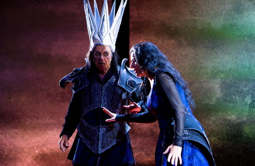 Es sind die glanzvollen Stimmen, mit denen sich die Lütticher Oper im italienischen Fach einen vorzüglichen Namen erwerben konnte. Der Bariton Leo Nucci gehört mit zahlreichen Auftritten als Nabucco, Rigoletto und Macbeth nicht nur zum engen Freundeskreis von Intendant Stefano Mazzonis di Pralafera, sondern schon quasi zum Ensemble des Hauses. Mit 76 Jahren steht er jetzt erneut als Macbeth auf der Bühne. So ein hohes Alter ist dem Tyrannen bei Shakespeare zwar nicht vergönnt gewesen und auch bei Nucci sind stimmliche Verschleißerscheinungen nicht zu überhören. Die Stimme droht in bestimmten Bereichen unkontrolliert zu tremolieren, richtig runde Legato-Bögen gelingen nicht immer. Freilich hat Nucci Recht, wenn er darauf hinweist, dass er den Macbeth eher als Drama denn als Oper versteht. Die Darstellungskraft, auch auf Kosten lupenreiner Schönheit, habe schließlich auch Verdi besonders betont. Insofern imponiert Nucci in der Rolle immer noch mit einer großen, konditionsstarken Stimme und einer beachtlichen Bühnenpräsenz, die freilich durch die unglückliche Maske und das noch problematischere Kostüm ein wenig getrübt wird. Auf der Bühne sieht er gut 20 Jahre älter aus als in Natura, seine Krone erinnert eher an einen indianischen Häuptlingsschmuck und sein schweres Kostüm wirkt wie die Leihgabe aus einem historischen Museum.