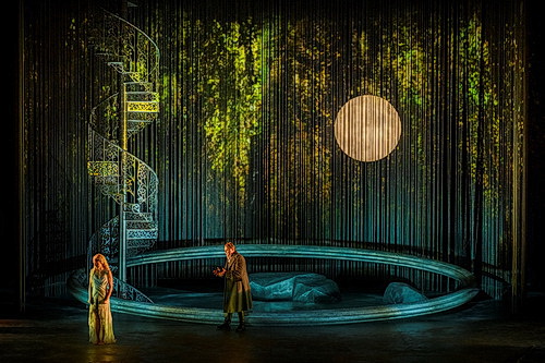 Der griechi­schen Regis­seurin Rodula Gaitanou gelingt es, märchen­hafte Magie und psycho­lo­gische Analyse in Balance zu bringen. Der sagen­um­wit­terte Charakter des Werks bleibt erhalten, was nicht zuletzt der Bühnen- und Kostüm­bild­nerin Cordelia Chisholm zu verdanken ist. Ohne antiquierten Plüsch schafft sie eine Wald- und Teich­land­schaft, die mit einer blumen­ver­zierten Wandel­treppe und einem großen, vertikal verschieb­baren Metall­kranz die Wechsel zwischen den Welten der Menschen und der Nixen pointiert und, kongenial ausge­leuchtet, stimmungsvoll ermöglicht.