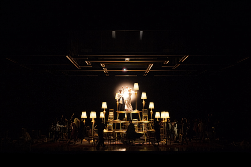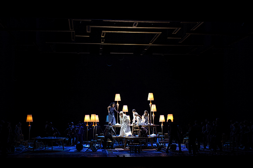 Ollé überrascht mit solidem Regis­seurs­handwerk. Ein paar Spiegel­fech­te­reien baut er ein, aber die sind kaum der Rede wert. Der Regisseur ist einer der sechs Künst­le­ri­schen Leiter der spani­schen Theater­gruppe La Fura dels Baus, der er seit der Barcelona-Zeit angehört. Das Kollektiv zeichnet sich unter anderem dadurch aus, dass es sich schon früh intensiv mit den Gestal­tungs­mög­lich­keiten im Internet ausein­an­der­ge­setzt hat. In Lyon ist davon nichts zu sehen. Alfons Flores hat eine schöne Bühne gebaut, die sehr geschickt mit Tischen, Stühlen und Lampen arbeitet. Da entstehen mitunter sehr schöne allego­rische Bilder, die bei einer Aufführung im Saal mit Publikum sicher gut funktio­niert hätten. Bis auf einen sehr gelun­genen Kniff bietet Josep Abril Janer recht konven­tio­nelle Kostüme, die sich unauf­fällig in das Gesamtbild einfügen. Das wird von Urs Schönebaum als typisches Theater­stück ausge­leuchtet. Auf der Bühne sind von Dukas wenige Menschen vorge­sehen, also füllt Ollé mit Chor und Statisten auf.