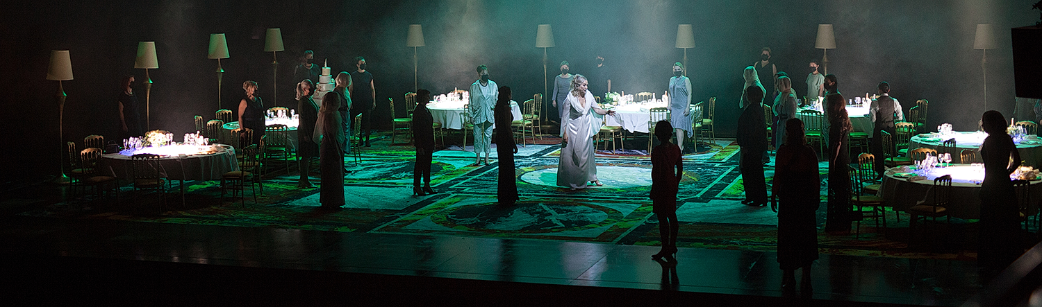 Ollé überrascht mit solidem Regis­seurs­handwerk. Ein paar Spiegel­fech­te­reien baut er ein, aber die sind kaum der Rede wert. Der Regisseur ist einer der sechs Künst­le­ri­schen Leiter der spani­schen Theater­gruppe La Fura dels Baus, der er seit der Barcelona-Zeit angehört. Das Kollektiv zeichnet sich unter anderem dadurch aus, dass es sich schon früh intensiv mit den Gestal­tungs­mög­lich­keiten im Internet ausein­an­der­ge­setzt hat. In Lyon ist davon nichts zu sehen. Alfons Flores hat eine schöne Bühne gebaut, die sehr geschickt mit Tischen, Stühlen und Lampen arbeitet. Da entstehen mitunter sehr schöne allego­rische Bilder, die bei einer Aufführung im Saal mit Publikum sicher gut funktio­niert hätten. Bis auf einen sehr gelun­genen Kniff bietet Josep Abril Janer recht konven­tio­nelle Kostüme, die sich unauf­fällig in das Gesamtbild einfügen. Das wird von Urs Schönebaum als typisches Theater­stück ausge­leuchtet. Auf der Bühne sind von Dukas wenige Menschen vorge­sehen, also füllt Ollé mit Chor und Statisten auf.