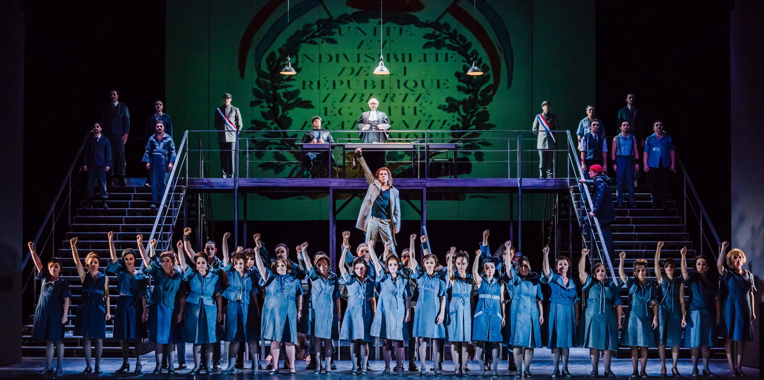 In Dantons Tod geht es um die Französische Revolution, aber auch um Terror, Massenmanipulation und Populismus. Themen, die auch in der heutigen Welt vielerorts aktuell sind. Karen Stone belässt das Stück denn auch nicht in der Zeit des ausgehenden 18. Jahrhunderts. Sie zeigt es stattdessen in zeitloser Moderne mit Anklängen ans Historische auf mehreren Ebenen, die durch Treppen verbunden sind. Bühnenbildner und Ausstatter Ulrich Schulz hat sich vor allem inspirieren lassen von der Mode der 1960-er Jahre, ohne aber beispielsweise auf die so genannte Achtundsechziger-Revolution hinzuweisen, auch Anspielungen auf Kommunismus oder Faschismus bleiben außen vor. Also keine konkrete, eindeutige Aktualisierung. Nein, Stone geht es wirklich um die zeitlos-aktuelle Frage, wie und auf wessen Kosten ein gerechtes System politisch durchgesetzt werden kann. In der Konfrontation der beiden Hauptfiguren, des fanatischen, grausamen Machtmenschen Maximilien de Robespierre und des idealistischen Freiheitskämpfers Georges Danton macht sie nur zu deutlich, dass das Sprichwort, dass am Ende die Revolution ihre eigenen Kinder frisst, meist recht behält. Nicht nur in Frankreich. Und nicht nur am Ende des 18. Jahrhunderts. Stone führt ein eindrucksvolles Stück moralischen, um nicht zu sagen, politischen Musiktheaters demonstrativ vor. Sie lässt den Chor der manipulierbaren, wankelmütigen und sensationslüsternen Masse immer wieder die geballte Faust gen Himmel strecken. Erinnerungen an Massenveranstaltungen in zwei unterschiedlichen Regimes Deutschlands kommen hoch. Das wirkt zuweilen etwas plakativ. Aber es hat durchaus seine massenpsychologische Wahrheit.