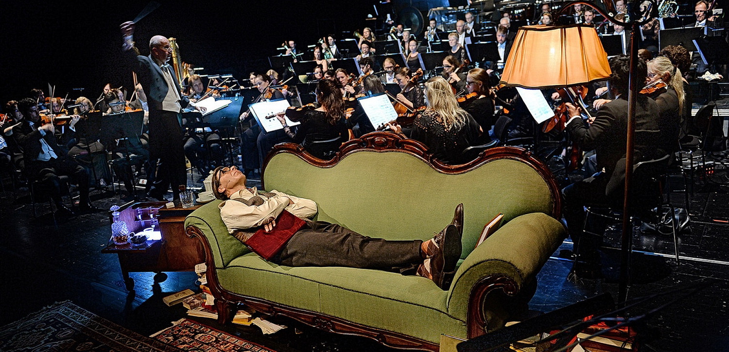 Das Staats­theater Mainz hat nun diese Loriotsche Fassung des Ring an einem Abend wieder auf den Spielplan gesetzt. Großes Orchester auf der Bühne, Solisten in edler Robe, wie bei einer ganz normalen konzer­tanten Aufführung. Doch es gibt ein paar kleine, aber wichtige Requi­siten im vorderen Bühnen­ab­schnitt. Ein original grünes Loriot-Sofa, eine Leihgabe des Theaters Hagen, eine Stehlampe, ein kleiner Tisch mit einer Porzellan-Kaffee­kanne, eine Kaffee­tasse und eine Glaska­raffe mit einem guten Tropfen Hochpro­zen­tiges. Um das Sofa herum liegen verstreut viele Bücher, eine gemüt­liche Leseecke, wie man sie sich vielleicht gerne zu Hause wünscht. Und dann kommt der Erzähler, der Schau­spieler Max Hopp, auf die Bühne, mit schwarzer Hornbrille, Tweed-Weste und karierten Socken, eine Hommage an Loriot. Und er nimmt Platz auf dem grünen Sofa, Körper­haltung und Gestus wie das große Vorbild, und er beginnt in leicht näselndem Tonfall, der mehr an Theo Lingen als an Vicco von Bülow erinnert, Loriot zu rezitieren: „Die Täter im gewal­tigsten Drama der Musik­ge­schichte sind doch eigentlich ganz nette Leute. Leider wollen diese netten Leute mehr besitzen, als sie sich leisten können und vernichten damit sich selbst und die Welt, aber zum Glück gibt es dergleichen nur auf der Opern­bühne.“ So fasst der Meister des feinsin­nigen Humors Wagners „Opus Summum“ in gut drei Stunden zusammen, ohne Loriots subtilen Wortwitz und Pointierung zu verändern, aber mit eigener Note. Und so führt Max Hopp mit einem Augen­zwinkern durch Wagners Heldenepos vom berühmten Vorspiel auf dem Grund des Rheins bis zum finalen Brand der Götterburg Walhall. Eine der schönsten Zitate aus dieser Version ist die Szene, wenn Siegfried im dritten Aufzug Brünn­hilde erweckt und ihr den Brust­panzer entfernt: „Kaum hat Siegfried das schwere Oberteil geöffnet, wölbt sich ihm der Busen eines hochdra­ma­ti­schen Soprans entgegen. Nachdem sich der Held von diesem Schock erholt hat, macht er eine durchaus richtige Beobachtung: Das ist kein Mann! Zum ersten Mal in seinem Leben empfindet er nackte Furcht und verhält sich wie alle jungen Männer in dieser Situation; er schreit nach seiner Mutter.“ Herrlicher und komischer, ohne Verfäl­schung des Inhaltes, kann man diese Situation nicht beschreiben. Loriot liebt seinen Wagner, und bei aller Ironie und allem Wortwitz bleibt der Respekt vor dem Schaffen des großen Kompo­nisten immer erhalten. Und Hopp gelingt der Spagat, sich einer­seits von dem großen Schatten Loriots zu lösen, ihn nicht einfach nur zu kopieren, sondern dem „Erzähler“ eine eigene Persön­lichkeit zu geben. Hopp beobachtet, während der musika­li­schen Darbie­tungen bleibt er auf seinem Sofa sitzen, oder steht auf, seinen Blick immer auf die Protago­nisten gerichtet wie ein kriti­scher Beobachter, ohne eigene Regungen. Nur am Schluss kommt eine ganz inter­es­sante und aufschluss­reiche Geste. Zu den Schluss­ak­korden des Orchesters findet er den verfluchten Ring auf dem Grund seiner Kaffee­tasse, in die ihn Brünn­hilde in ihrem Schluss­gesang hat fallen lassen. Mit einem spitz­bü­bi­schen Lächeln und einem erstaunten Augen­zwinkern steckt er ihn in seine Westen­tasche, nachdem er zuvor lapidar bemerkt hat, dass er die Hoffnung habe, dass es mögli­cher­weise auch „unseren Göttern dämmert“. Ein doch eher frommer Wunsch.