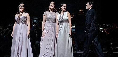 Einge­bettet in die Hoppschen Erzäh­lungen wird auch gespielt und gesungen, und das zum größten Teil auf hohem Niveau. Derrick Ballard in der Rolle als Wotan und Wanderer verfügt über einen edlen Bariton mit schmei­chelndem Timbre und einer warmen Mittellage, die im Ausdruck sehr flexibel ist. Daniela Köhler als Brünn­hilde weiß mit ihrem klaren, drama­ti­schen Sopran und den leuch­tenden Höhen zu überzeugen. Berührend Ihre Todes­ver­kün­digung gegenüber Siegmund, strahlend ihr Schluss­gesang. Es ist nur noch eine Frage der Zeit, wann sie diese Partie(n) auf der Bühne in toto verkörpern wird. Alexander Spemann überzeugt sowohl als listiger Loge als auch als Siegfried mit Stahl im Tenor, besonders beim großen Schluss­finale Siegfried zusammen mit Diana Köhler. Peter Felix Bauer setzt mit den Partien Alberich und Gunther einen starken Kontra­punkt, insbe­sondere mit der Verflu­chung des Rings, und Linda Sommerhage als Götter­gattin Fricka reüssiert mit einem sehr warmen Mezzo­sopran. Während Vida Mikne­viciute besonders als Sieglinde mit leuch­tendem, jugendlich drama­ti­schem Sopran begeistert und auch als Gutrune Akzente setzt, hat Eric Laporte mit der Partie des Siegmund vor allem in den drama­ti­schen Ausbrüchen große Schwie­rig­keiten in den Höhen. Ein stimmlich wie optisch wunder­bares Trio bilden Dorin Rahardja, Maren Schwier und Katja Ladentin als die drei Rhein­töchter. Stephan Bootz als fieser Bösewicht Hagen weiß nicht nur mit seinem schwarzen Bass Gänsehaut zu erzeugen, auch in Haltung und Gestus so ausdrucks­stark, dass einen das Gefühl beschleicht, dem möchte man nachts allein nicht im Dunkeln begegnen.
