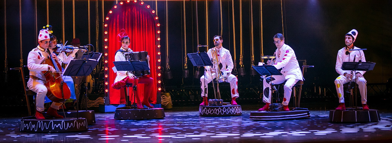 Die Musik ist unver­kennbar Philip Glass. Fröhliche und beschwingte synko­pische Rhythmen, mit einem Schuss melan­cho­li­scher Würze, webt das sieben­köpfige Ensemble seine Magie. Obwohl die Zirkus­nummern per Definition hochpräzise und immer gleich sein müssen, werden diese Nummern von Menschen ausge­führt und sind daher nie mecha­nisch geklont. Und so reflek­tiert auch die Musik unter­schied­liche Akzente und Wendungen, während sie den kreis­för­migen, sich immer wieder­ho­lenden Lebens­zyklus durch­läuft.  Die Musiker – auch in aufwän­digen Kostümen – sind auf mobilen Wagen platziert, die unter der Leitung von Minna Weurlander am Akkordeon auf der Bühne bewegt werden.