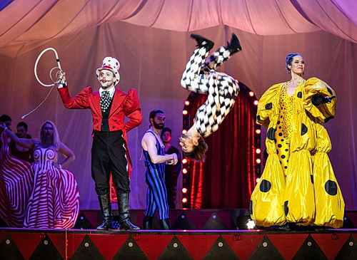 Magdalena Åberg schuf zauber­hafte Bühnen­bilder und Kostüme mit einer Anspielung auf die Vergan­genheit: Die ikonische Ästhetik der japani­schen Künst­lerin Yayoi Kusama hat sicherlich das Kleid der Frau des Zirkus­di­rektors inspi­riert, mit seinen schwarzen Tupfen auf gelbem Grund und der Kürbisform. Das epochale Triadische Ballett der frühen Bauhaus-Ära in den 1920-er Jahren, entworfen vom Künstler Oskar Schlemmer, mit seinen urwüch­sigen Farbblo­ckie­rungen dürfte für viele der anderen umwer­fenden Kostüme Pate gestanden haben. Auch das Zelt und seine Takelage muss erwähnt werden, denn das unbelebte Objekt hat ein Eigen­leben, ja eine eigene Choreo­grafie – die riesigen Flächen aus weißem Stoff zusammen mit der kompli­zierten Takelage und dem kreis­för­migen Laufsteg, alles unter der Kontrolle von Saar Rombout, ist am beein­dru­ckendsten, wenn es ab- und wieder aufgebaut wird und trägt zum Thema bei, weil die kleinsten Elemente genauso wichtig für das gesamte physische und philo­so­phische Thema der Insze­nierung sind.