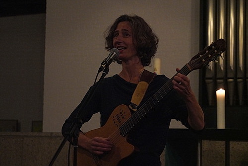 Jetzt ist sie in ihre Geburtsstadt eingeladen. Wer im Stadtteil Büderich etwas musikalisch aufführen will, hat ein Problem. Da gibt es das Gymnasium und Kirchen. Also fällt die Wahl auf die Betlehem-Kirche. Eine nur eingeschränkt gute Wahl. Junge Leute verirren sich hierhin nicht, und die wenigen Alten legen ihre Jacken und Mäntel erst gar nicht ab. Schon jetzt, bei Außentemperaturen um die 17 Grad, ist es in der Kirche recht frisch. Wie das wird, wenn die Kirchen tatsächlich ihre Raumtemperatur auf 16 Grad absenken wollen, wird man sehen. Nach dem heutigen Stand wird es wohl rasch zu leeren Sitzplätzen führen. Orchester werden in solchen Räumen nicht mehr auftreten können. Auch Bachmann, die seit 2008 die kleinen und mittleren Bühnen kennt, muss erst mal ihre gesamte Professionalität aufbieten, um sich von dem Szenario nicht aus der Ruhe bringen zu lassen. Ist die Betlehem-Kirche nicht voll besetzt, wirkt sie gleich armselig leer. Die Kälte wirkt nicht unbedingt erheiternd, und die E‑Gitarre, deren Saiten klirren und scheppern, erreicht nicht die gewünschte Lautstärke.