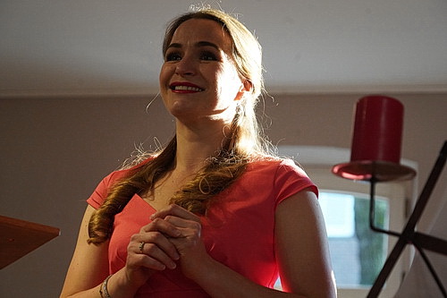 Eine kleine Überraschung gibt es mit dem Wechsel ins russische Fach, in dem Porizko eine Elegie von Wassilij Kalinnikow auf dem Klavier erzählt. Für die Kantorin ist er schlicht der Stellvertreter für das Typische der russischen Musik. Unvorstellbar, was er hätte erreichen können, wenn er länger als bis in die Anfänge seiner 20-er Jahre gelebt hätte. Auch diese traurige Geschichte kann die Laune des Abends nicht mehr verderben. Der Frühling hat jetzt uneingeschränkt begonnen. Das unterstreichen auch noch einmal die beiden Werke von Tschaikowski: Frühlingslied und Ich öffnete das Fenster, begleitet von ein paar kleinen Anekdoten, die Porizko zum Besten bringt. Nein, die Fenster werden im Küsterhaus trotz des wundervollen Sonnenuntergangs nach einem Tag eher betrüblichen Wetters nicht geöffnet. Die Durchgangsstraße, an der das Küsterhaus liegt, lässt solche Leichtfertigkeiten nicht zu. Gefühlt aber reißt Somicheva, die bis hierhin mit glockenklarem Klang bis hin zu großen Koloraturen überzeugen kann, die Fenster der Seele auf, wenn sie mit Je veux vivre, der Arie der Juliette aus der Oper Roméo et Juliette von Charles Gounod, als Zugabe intoniert.