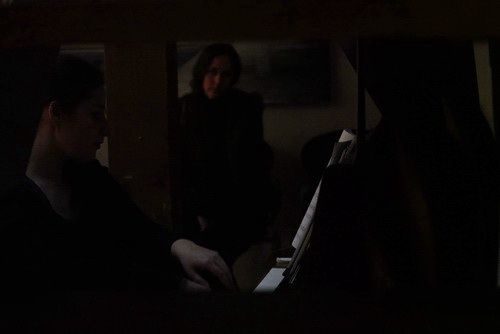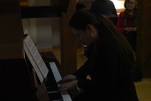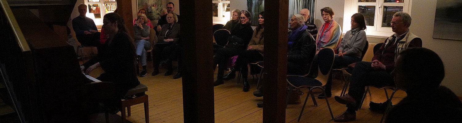 So wie heute Abend. Porizko und ihr Team haben alles so schön vorbereitet. Über dem Klavier ist eine Happy-Birthday-Girlande gespannt. Die Künstlerin hatte in der vergangenen Woche Geburtstag. Das soll jetzt ein bisschen nachgefeiert werden. Und gern stimmen die Besucher in das Geburtstagsständchen ein, aus dem Porizko kurzerhand einen Kanon macht, indem sie ganz locker die Runde in vier Gruppen einteilt und dirigiert. Als erfahrene Chorleiterin motiviert sie das Publikum im Handumdrehen. Anschließend könnte eigentlich das Konzert beginnen. „Das Licht blendet!“ ertönt es aus der Runde. Weil die Lichtregie in der Tat nur halbherzig durchdacht ist, weil für das Licht ohnehin bei der Vorbereitung immer zu wenig Zeit ist, werden also eifrig Schalter ausprobiert, bis der Raum nahezu vollständig im Dunkel liegt, Porizko allmählich befürchten muss, ihre Noten nicht mehr lesen zu können. Da muss die Pianistin, die heute keine Gäste eingeladen, sondern selbst einen Vortrag vorbereitet hat, doch schon mal kurz mit der Fassung ringen, als sie noch einen Nachzügler durch das Fenster entdeckt, der aber nicht hineinkommt, weil die Außentür verriegelt ist. Ein kurzer Hinweis, schon stürmen zwei Helferinnen los, um den verspäteten Besucher einzulassen. Das gewinnt allmählich schon an Komik. Und dann kehrt im verdunkelten, aber blendfreien Raum doch noch Ruhe ein.