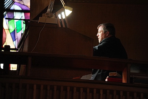 Und dann wird es doch historisch. Im kommenden Monat wird die Mauritius-Kirche 130 Jahre alt. Daran erinnert Strauss mit Hugo Distlers Werk Wo Gott zum Haus nit gibt sein Gunst aus den Spielstücken für die Kleinorgel aus dem Jahr 1938. Dazu begibt Strauss sich an ein Harmonium, dessen Klang – auch das verrät das Programm – dem der Kleinorgeln der Mitte des 20. Jahrhunderts nachempfunden ist. Eine hübsche Idee, die musikalisch eher unbedeutend, aber wichtig als Zwischenspiel zwischen der Messe und dem nächsten Werk erscheint. Denn zum Abschluss hat Strauss ein eigenes Werk aus dem Jahr 2015 auf die Agenda gesetzt, dass nun einmal alle Akteure fordert. Der Chor nimmt Aufstellung, davor die Solistengruppe, zu der sich nun auch Susanne Strauss gesellt, rechts vom Klavier und dem dahinterstehenden Orgeltisch die beiden Instrumentalisten. Einen „etwas parodistischen Gruß an Georg Friedrich Händel“ nennt Strauss die Vertonung des Psalms 45 Ein Braut lied und vnterweisung der kinder Korah. Auch hier hat der Musiker die Orgelstimme der Originalfassung für Trompete, Kontrabass und Klavier neu arrangiert. Auch hier nimmt er den Chor noch einmal ordentlich in die Pflicht, aber die Choristen nehmen die Herausforderung der „neuen Klänge“ gerne an. Und nach rund zehn Minuten steht die Freude über den gelungenen Auftritt den Akteuren ins Gesicht geschrieben.