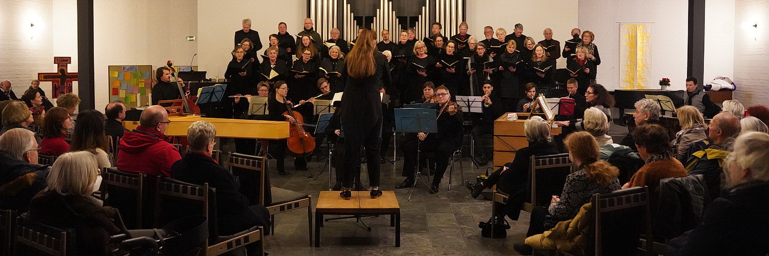 Nun ist die Bethlehem-Kirche im Meerbuscher Stadtteil Büderich eher ein kleiner Versammlungsraum, der auch nicht für seine Akustik berühmt ist. Da bedarf es schon eines Meisters, um dort das Weihnachtsoratorium aufzuführen, wenn es nicht gleich ganz unmöglich ist. Es hat schon etwas von einem kleinen Wunder, wenn man sieht, wie die Menschen in die Kirche strömen, mehr als die Hälfte von ihnen gehören nicht einmal der Gemeinde an. Schnell werden weitere Stühle in den Kirchenraum geschoben, die genauso rasch wieder besetzt sind. Es ist später Nachmittag, überhaupt kein Zeitpunkt, um zu einem Konzert in die Kirche zu gehen. Das scheinen die Menschen, die den Raum bis zum Bersten füllen, nicht zu wissen. Hier gibt es die allbekannte Anordnung. Im Hintergrund die Kantorei der evangelischen Kirchengemeinde Büderich mit etwa 35 Personen, davor nimmt die Philharmonia Frankfurt Platz. Rechts und links davon ist noch Platz für ein Cembalo und ein Orgelpositiv. Zwischen Orchester und Publikum ist noch eine schmale Gasse für die Solisten freigelassen. Das Podest der Dirigentin steht bereits gleichauf mit der ersten Stuhlreihe. Bei den Außentemperaturen freut man sich ja geradezu, ein wenig enger zusammenzurücken.