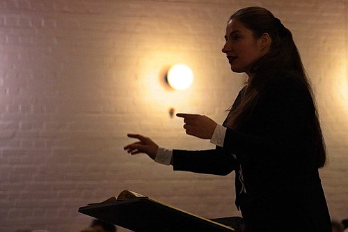 Porizko ist nicht so vermessen, das ganz Große zu wollen. Vielmehr setzt sie die ihr zur Verfügung stehenden Mittel klug ein, um „ihre“ Musik wirken zu lassen. Spielen lässt sie die ersten drei Teile des Oratoriums. So werden die rund zweieinhalb Stunden des Gesamtwerks auf gerade mal knappe anderthalb Stunden gekürzt. Sehr angenehm. Und weil es keinen Bass gibt, werden die Bass-Arien halt durch Sopran-Arien ersetzt. Was gibt es Schöneres als Fantasie in der Musik? Und bei der Echo-Arie … aber davon gleich. Zunächst einmal eröffnet Tenor Lothar Blum als Evangelist seine schöne Erzählung. Schön in dem Sinne, dass er es nicht mit dem Rezitativ-Klang übertreibt, sondern gleichzeitig um Textverständlichkeit bemüht ist. Hier allerdings begräbt dann doch die Akustik bei allen Beteiligten jede Hoffnung. Das ist auch bei Ekaterina Somicheva nicht viel anders, die ihren Sopran wunderbar abmildert und sich stimmlich ganz hervorragend in das Gesamtgefüge einpasst. Wie es überhaupt wohl der Hauptverdienst Porizkos ist, als Dirigentin eine absolut ausgeglichene Balance herzustellen. So etwas hört man sonst nur, nachdem die Tonmeister der öffentlich-rechtlichen Hörfunksender an ihren Reglern in den Übertragungswagen gewirkt haben. Die gibt es hier übrigens nicht. Anderes Thema. Stella Antwerpen vollbringt als Altistin eine Glanzleistung. Einmal mehr zeigt sie eine wunderbare Facette ihres Stimmvermögens, wenn sie weich und rund wie eine Perle ihre Stimme erklingen lässt. Der Höhepunkt ist sicher erreicht, wenn sie von der Geigerin Maria Krivenko begleitet wird. Auch der Chor geht deutlich über die Erwartungen an einen kleinen Kirchenchor hinaus. Das liegt nicht nur an den stimmlichen Fähigkeiten, sondern auch an den Anforderungen, die Porizko bereits bei der Matthäus-Passion an die Choristen gestellt hat. Jeder einzelne ist hier mit außergewöhnlichem Engagement dabei.