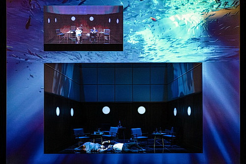 Als der Vorhang sich öffnet, sieht man einen rechteckigen Bau, der von einem großen Rahmen umgeben ist. Der Rahmen wird die Projektionsfläche für die Installationen sein, im engen Raum spielt sich die Handlung in der Realität ab. Das Bühnenbild stammt von Susanne Gschwender. Das Innere des Raums stellt eine Schiffskabine dar, in der Tristan und Kurwenal als Kapitän und Erster Offizier sowie Isolde und Brangäne als Passagiere in einem modernen Setting sitzen. Oberhalb des Bühnenraums wird nicht nur der Text als Übertitel eingeblendet, sondern das ganze ist ein Splitscreen, wo die Szene in der Kabine live übertragen wird. Wer jetzt denkt, der Splitscreen ist ein neuer und moderner Service, den Gesangstext besonders zu präsentieren, der weiß noch nicht um die besondere Bedeutung des Screens.