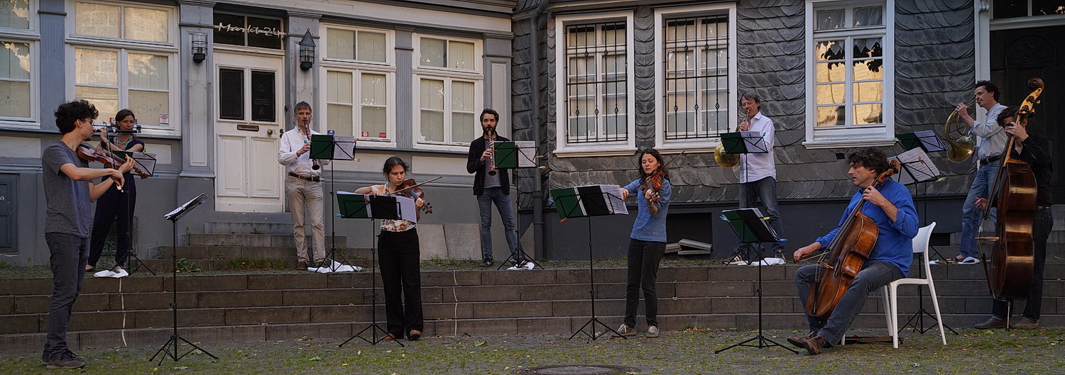 Die Musiker postieren sich auf den Stufen, oberhalb die Bläser, darunter die Streicher. In großem Rund und mit mehr als nötigem Abstand versammeln sich die Besucher. Manche von ihnen haben, wie empfohlen, eigene Sitzgelegenheiten mitgebracht, andere sitzen etwas weiter entfernt auf den Stufen oder ganz einfach auf dem Boden oder stehen entspannt beieinander. Es herrscht eine friedliche, gelöste Stimmung, wenn die Nachbarn für die Nachbarn Musik machen. Und zwar unter deutlich erschwerten Bedingungen. Denn die Abstände führen dazu, dass die Musiker gerade in den leiseren Passagen kaum die Instrumente der Kollegen hören können. Und so entsteht so etwas wie ein professioneller Blindflug. Den Besuchern, sofern sie es überhaupt bemerken, ist das völlig schnuppe. Denn der Compagnia di Punto gelingt es, vor der pittoresken Häuserkulisse einen geradezu zauberhaften Klang zu entfalten, der hier selbst Menschen gefangen nimmt, die sich nicht zu den Freunden klassischer Musik zählen.