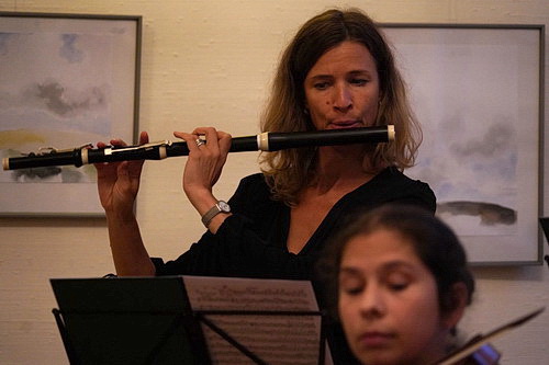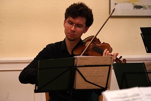 Evgeniy Sviridov erwischt es als Konzertmeister. Seine Saite reißt. Jeder Konzertbesucher in den Großbetrieben wünscht sich, das einmal zu erleben, wie dann blitzschnell eine Geige von den hinteren Rängen durchgereicht wird, damit der Erste Geiger weiterspielen kann. In der Kulturvilla Mettmann gibt es an diesem Abend exakt zwei Geiger. Also wird das Konzert abgebrochen, Binde springt auf und überbrückt gekonnt, während Sviridov eine neue Saite aufzieht. Aber bitte schön, hier sind doch längst alle eine große Familie, und so wartet das Publikum geduldig, bis die Violine wieder einsatzbereit ist. Es ist ein wunderbar intimer Abend, weil die Musiker mit Leidenschaft arbeiten. Anna Dmitrieva stellt an der zweiten Geige die Kommunikation zwischen Konzertmeister und dem Cello von Alexander Scherf her, der mehr wie ein Band-Mitglied als ein seriöser klassischer Violoncello-Spieler wirkt. Mit seiner zupackenden Art vermittelt er das Gefühl, authentisch und modern zu sein. Florian Schulte bleibt mit seiner Bratsche ein wenig im Hintergrund. Ganz anders als Kit Scotney, der mit seinem Bass zwar hinter dem Orchester platziert ist, aber vermutlich auch einen guten Jazz-Bassisten abgäbe. Während Markus Schön und Sebastian Kürzl an den Klarinetten die Wärme herstellen, ist Annie Laflamme an der Flöte so etwas wie ein souveräner Libero, auf dessen Klang man immer wieder gerne wartet. Christian Binde und Jörg Schultess bedienen sich der historischen Hörner, um die Fülle des Orchesterklangs gekonnt zu vervollständigen.
