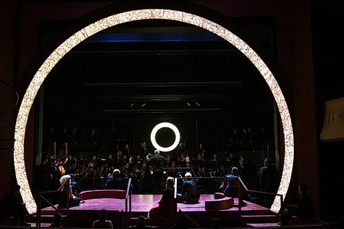 Auf der Leinwand vor dem hinten auf der Bühne positionierten Orchester sind die Videogestaltungen von Matthias Lippert in blauer Farbe zu sehen. Die Runen, Raben und Wolken spiegeln sich auf der roten Spielfläche dann in grün wieder, was einen tollen Effekt ergibt. In der punktgenauen Beleuchtung von Michael Kohlhagen fehlt nur die Farbe blau zum Finale, wenn der Rhein musikalisch über die Ufer tritt. Aber vielleicht ist die Reduzierung auf das Feuer so gewollt. Denn szenisch passiert so gut wie nichts mehr in diesem Moment, nachdem die Rheintöchter mit Ring und Hagen verschwunden sind. Nach und nach nimmt das Personal – egal ob gut oder böse, tot oder lebendig – auf der Bühne mit dem Rücken zum Publikum Platz. Der Blick geht zur Nordwestdeutschen Philharmonie, die nun im vollen Licht dasitzt. Nun liegt es am Orchester, das Ende der bestehenden Ordnung auszumalen. Dieses Vertrauen zahlt es doppelt und dreifach zurück. Nicht nur, dass die Instrumentalisten musikalisch diesen Moment meistern, der ihre großartig gespielte Vorstellung krönt, sie schaffen es sogar noch, einen gewissen Abschiedsschmerz einzufangen.