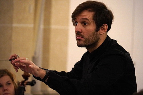 Das ändert sich beim nächsten Programm­punkt. Die 18 Streicher der Camerata Gladbach steigen in den Altarraum hinunter. Und sorgen für eine Überra­schung. Denn Richter, der an sich ein Freund von Gegen­warts­musik ist, hat sich von Arnold Schönberg nicht etwa ein Beispiel der Zwölfton-Technik ausge­sucht, sondern mit Verklärte Nacht ein spätro­man­ti­sches Frühwerk des Kompo­nisten ausge­wählt. Im Herbst 1899 kompo­nierte Schönberg während eines Ferien­auf­ent­haltes im nieder­ös­ter­rei­chi­schen Paybach sein halbstün­diges Strei­cher­konzert auf der Grundlage des gerade mal fünf Jahre zuvor erschie­nenen, gleich­na­migen Gedichts von Richard Dehmel. Dass die Camerata Gladbach, die eigentlich eher dazu tendiert, sich selbst zu organi­sieren, zur Aufführung dieses Werks auf einen Dirigenten zurück­greift, ist durchaus kein Zeichen von Schwäche, sondern eher der Wunsch, das komplexe wie wunder­schöne Werk in höchster Perfektion darzu­bieten. Mit Yorgos Ziavras haben die Musiker einen Musika­li­schen Leiter ausge­wählt, mit dem sie nicht nur wiederholt zusam­men­ge­ar­beitet haben, sondern der auch höchst engagiert die Finessen dieser Tondichtung heraus­ar­beitet. Ein großar­tiges Erlebnis, für das der Altarraum akustisch wie erschaffen scheint.