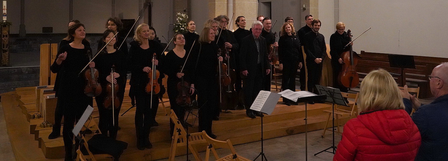 Wenn die Kirche am Sonntag­nach­mittag trotzdem sehr gut besucht ist, mag das am Vertrauen der Besucher in den Kantor Reinhold Richter liegen, der sie musika­lisch noch nie enttäuscht hat, auch wenn nicht immer nur der Kanon auf dem Programm­zettel auftaucht. Seit 1982 kümmert der studierte Kirchen­mu­siker und Organist sich als Kantor um die musika­li­schen Belange der Kirche. Heute hat Richter sich für das festliche Konzert für Orgel und Orchester Hilfe geholt. Ihm zur Seite steht – nicht zum ersten Mal – die Camerata Gladbach. 2014 wurde das Kammer­or­chester in offener Formation von Johanna Brinkmann und Tanja Chere­pashchuk gegründet, das sich zu großen Teilen aus Mitgliedern der Nieder­rhei­ni­schen Sinfo­niker zusammensetzt.