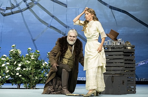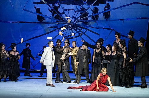 Erst als der riesige Spiegel sich leicht hebt, ergießt sich die Festge­sell­schaft unter ihm hindurch auf die Bühne, und das drama­tische Spiel nimmt seinen Verlauf. Dabei werden die verschie­denen Stimmungen der Protago­nisten durch effektvoll wechselnde Farbver­läufe in Szene gesetzt. Während Violetta zur Ouvertüre noch vor einem kühlen, schwarz-weißen Hinter­grund steht, wird der gesamte Bühnenraum mit Einlass der geladenen Gäste durch die Spiegel­re­fle­xionen in ein strahlend blaues Licht getaucht. Langsam wandeln sich die Farbge­bungen im Laufe des ersten Aktes entlang der Bruch­kanten des Spiegels von einem zarten Rosé hin zu tiefem Rot. Die stimmungs­volle Licht­regie ist ein beson­deres Marken­zeichen der Produk­tionen von Dijkema und auch an diesem Abend einfühlsam und faszinierend.
