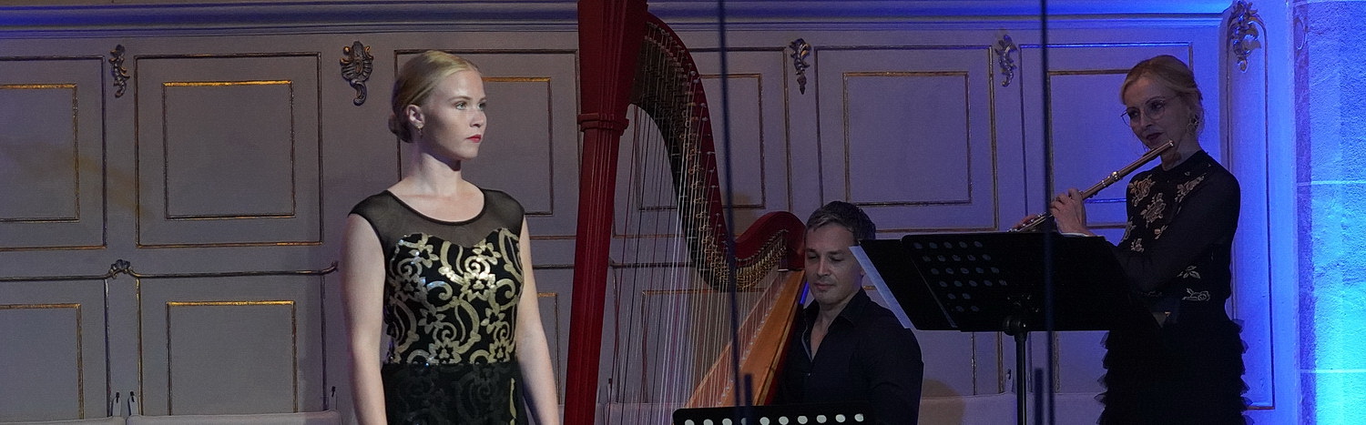 Auch bei diesem Konzert sorgt ein Förderer dafür, dass die Gäste in der Pause mit Getränken versorgt werden. Zum festlichen Anlass beschränkt man sich diesmal auf Wein und Wasser. Und so kann das Publikum sich frisch gestärkt wieder auf Claude Debussy einlassen. Nach der Arabesque No. 1 hat Jovy zu Syrinx für Flöte solo und Tanz einen weiteren großen Auftritt – im dritten und glanzvollsten Kostüm. Ceysson begeistert anschließend mit Alphonse Hasselmans‘ La source – Die Quelle – ehe Maiburg sich wieder dazugesellt, um Joseph Kosmas Autumn Leaves, also die Herbstblätter, zu Gehör zu bringen. Eines der schönsten Stücke des Abends kennt man eigentlich nur vom Klavier. Der Vogel als Prophet aus den Waldszenen von Robert Schumann gewinnt bei Flöte und Harfe enorm. In der Interpretation von Maiburg und Ceysson fühlt man sich eher an ein italienisches Liebeslied erinnert, das man gern an der Costiera Amalfitana in Abendstimmung genießt.