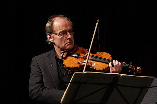 Wer an Spielstätten wie dem Wiener Musikverein auftritt, ist daran gewöhnt, vor dem ersten Takt noch einmal die Frackschöße zurückzuschlagen und darauf zu achten, dass die Lackschuhe keine Kratzer bekommen. Wer über so viel Lebenserfahrung wie die vier Musiker verfügt, weiß, dass solcher Glamour in der Schulaula oversized wirkt. Und so treten die Herren in dunkelgrauen Anzügen und Straßenschuhen auf. Ja, der Glamour der großen Auftritte fehlt in der Aula, aber dafür bekommen die Besucher etwas sehr viel Besseres geboten. Die Streicher nehmen gleich an der Rampe der großen Bühne Platz. Näher wird kaum ein Besucher den Musikern in den vergangenen vier Jahrzehnten gekommen sein. Hier ist Intimität Trumpf. Für seine einleitenden Worte braucht Lingenfelder nicht einmal ein Mikrofon. Früher wäre das sogar in dieser Aula anders gewesen. Aber die Pandemie fordert ihre Opfer auch in Monheim am Rhein. Und so sind nur die wirklich Mutigen zum Konzert erschienen. Hätte man angesichts dieser Situation nicht kurzentschlossen noch ein, zwei Schulklassen für lau einladen können? Platz wäre gewesen, die Schüler hätten ein Erlebnis fürs Leben mitgenommen und jede „Education“-Abteilung wäre vor Neid erblasst. Wir wissen nicht, welche Bedenkenträger hier jede Fantasie im Keim erstickt haben. Und so bekommt das Konzert schon fast Wohnzimmer-Charakter.