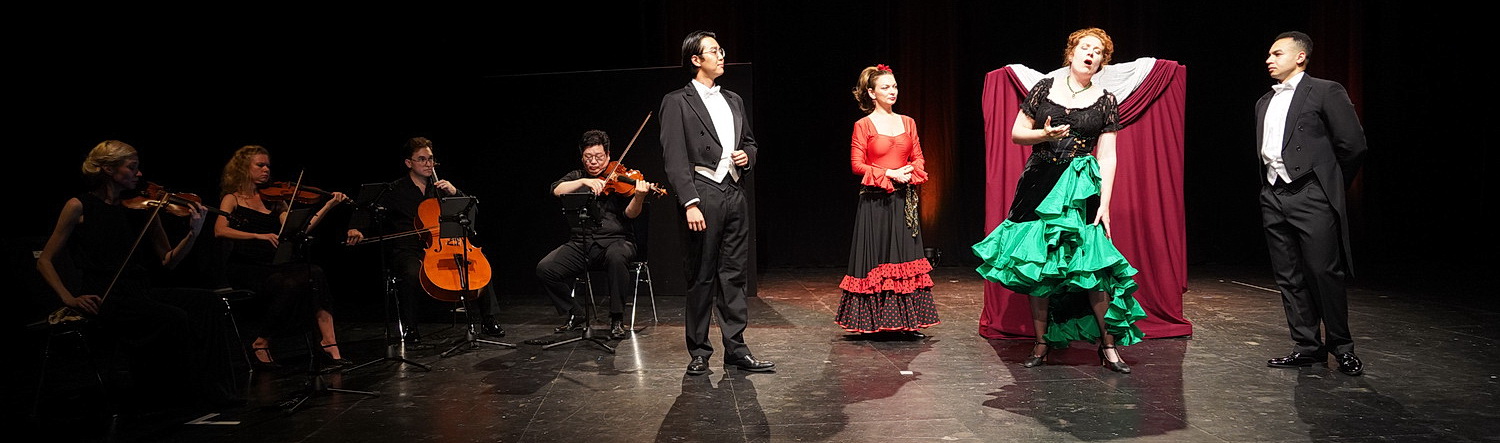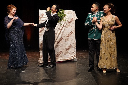 Und schon betreten die Opern­sänger die Bühne, um Heia, heia in den Bergen, das Lied der Sylva, vorzu­tragen. Zinzi Frohwein übernimmt die Rolle der Sylva – in den Folge­vor­stel­lungen wird sie sich mit Brodka abwechseln – und findet gleich zum rechten Ton des Operet­ten­stars. George Gamal steht ihr als Edwin zur Seite und beweist einmal mehr, dass er das Zeug zu einer großen Karriere als Bariton hat, wenn er nicht nur mit der Stimme, sondern auch mit der Ausstrahlung überzeugt. Gerade aus China zurück­ge­kehrt, bringt Tenor Hong Zhou viel gute Laune bis zum Spitz­bü­bi­schen mit, um Boni, den Freund Edwins, darzu­stellen. Maija Tutova glänzt ebenfalls stimmlich und zeigt viel Spiel­freude, vor allem, wenn sie im Carmen-Kostüm auftritt. Und so versprühen sie den Champagner in ihren Kehlen, wenn sie von Lied zu Duett, von Terzett zum Quartett eilen. Die Begeis­terung des Publikums steigt von Auftritt zu Auftritt.
