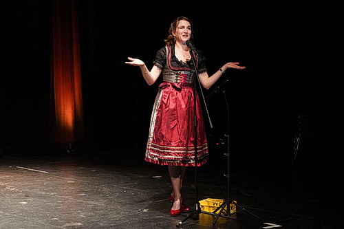 Brodka erweitert den Vortrag um zwei Einfälle. Zum einen dürfen die Protago­nisten auch tanzen. Eine hübsche Idee, und die Schritte sind auch eingeübt. Aber in der Premiere ist da noch viel Blei in den Beinen. Die operet­ten­hafte Leich­tigkeit, die hier eigentlich unter­strichen werden soll, wird sich wohl erst in den folgenden Auffüh­rungen einstellen, aber dann wird es ein echter Gewinn werden. Das größere Risiko geht Brodka sicher damit ein, die Vorstellung um fünf Statisten aus dem Publikum zu erweitern. Erwar­tungs­gemäß reißt sich keiner darum, auf die Bühne zu kommen. Davon lässt sich das Energie­bündel Brodka nicht irritieren. Alsbald finden sich drei Damen, die zu Varieté-Mädels werden, ein Notar, der gelungen die Feder schwingt und eine stumme Rolle, bei der die fehlende Berüh­rungs­angst des Statisten für viel Heiterkeit sorgt. Das Glück ist mit den Tüchtigen, und so zeigt Brodka in der Wahl ihrer Statisten ein wahrhaft glück­liches Händchen.