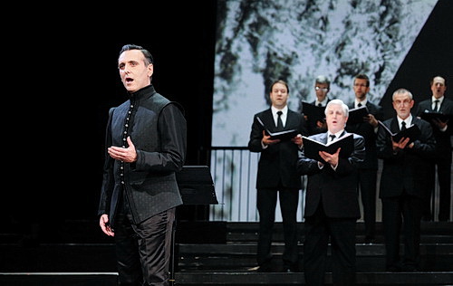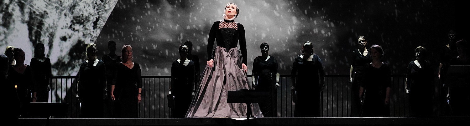 Und doch kommt durch den geschickten Bühnenaufbau mit einer großen Videoleinwand im Hintergrund und den historisch erscheinenden, aufwändigen Kostümen großes Operngefühl auf. Die Handlung, 1536 in England spielend, ist auch genau in dieser Zeit verortet. Während der ganz in schwarz gekleidete Chor mit ausreichendem Abstand auf den Stufen der Hinterbühne platziert ist, wird das Bühnenbild durch entsprechende Videoeinspielungen von Meike Ebert und Raphael Kurigund sowie durch eine geschickte Lichtregie von Michael Heidinger ersetzt. Palastfenster in unterschiedlichen Farben sowie vor allem am Schluss dem Plot entsprechende Einspielungen von Regen und Schnee geben die düstere Stimmung am Hofe wieder. Einen schönen Kontrast dazu bietet die Soloharfe auf der Bühne. Für das Staging und auf der Bühne zeigt sich Maximilian Berling verantwortlich. Dieser Minimalismus auf der Bühne stellt natürlich die Sänger in ihren ansprechenden Kostümen von Inge Schäffner in den Vordergrund und überzeugt durch die optischen Reize und die großartige Musik.