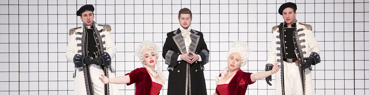 In der Vorweihnachtszeit stehen auf den Programmzetteln der volksnahen Opernhäuser oft Werke wie Hänsel und Gretel, La Bohème oder Der Nussknacker mit garantiert ausverkauftem Haus. Umso überraschender ist der Termin der Spielzeitpremiere von Mozarts „Dramma giocoso“ Così fan tutte kurz vor dem dritten Adventswochenende. Seit über sieben Jahren ist das Werk im Repertoire, trotzdem hat der Abend etwas von Premierenfeeling. Alle sechs Solisten des Werkes sind feste Ensemblemitglieder des Gärtnerplatztheater, und bis auf Maximilian Mayer in der Rolle des Ferrando geben alle anderen Solisten an diesem Abend ihr Rollendebüt. Insofern ist Spannung angesagt, und GMD Anthony Bramall lässt es sich nicht nehmen, den Abend aus der Proszeniumsloge aufmerksam zu verfolgen. Hinzu kommt die leichte Brisanz, dass erst vor sechs Wochen das Werk in der Bayerischen Staatsoper seine Premiere gefeiert hat.