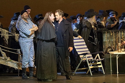 An der Bayerischen Staatsoper München steht die Wiederaufnahme von Richard Wagners Der Fliegende Holländer für insgesamt vier Vorstellungen auf dem Programm. Die Inszenierung von Peter Konwitschny, etwas in die Jahre gekommen, scheint aber über 17 Jahre nach der Premiere immer noch zu zünden, auch wenn die Bayerische Staatsoper an diesem Abend nicht ganz ausverkauft ist. Dass Konwitschny ein Altmeister des Regietheaters ist, der einerseits mit Wagners Werken kritisch, aber immer am Werk orientiert umgeht, ist bekannt. Umso verblüffender ist der Beginn des Werkes. Bei der Ouvertüre bleibt der Vorhang zu, kein von der Musik ablenkendes Nebengeschehen auf der Bühne, wie es heute leider so üblich ist. Dem Kenner des Werkes fällt sicher auf, dass das Bayerische Staatsorchester unter der Leitung von Lothar Koenigs die Urfassung spielt, also ohne das Erlösungsmotiv am Schluss der Ouvertüre und dem Finale des dritten Aufzuges. Deutet sich hier schon die Intention Konwitschnys an, den Holländer aus seiner Verdammnis nicht zu erlösen? Als der Vorhang sich zum ersten Aufzug öffnet, muss man sich erst mal verwundert die Augen reiben. Eine düstere wild-romantische Szenerie bietet sich da auf der Bühne. Ein großes gemaltes Bild im Hintergrund zeigt das wild aufgepeitschte Meer, es stürmt und pfeift aus allen Löchern auf der Bühne. Zwei angedeutete Felsen symbolisieren die Bucht Sandwike, eine Landungsbrücke deutet das Schiff Dalands an. Daland, der Steuermann, und die Matrosen sind eher zeitlos gekleidet, aber der Auftritt des Holländers ist der nächste Clou. Gekleidet wie ein Edelmann aus dem 16. Jahrhundert, mit einer Zigarre im Mund. Das soll eine Inszenierung von Konwitschny sein? So klassisch, fast schon kitschig-romantisch, sowas hat man lange nicht mehr auf der Opernbühne gesehen. Doch wer Konwitschny kennt, der weiß, dass da noch was kommen muss, denn für diesen Inszenierungsstil ist der Regisseur nun wahrlich nicht bekannt.
