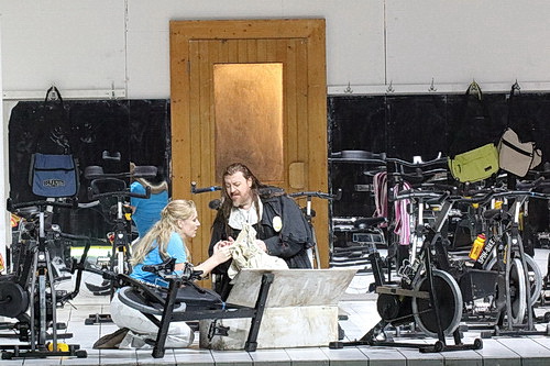 Nach der Ballade, als die Damen von Mary sanft aus dem Studio herauskomplimentiert worden sind, erscheint Erik, Sentas Verlobter, der verzweifelt um ihre Liebe kämpft. Wie zu erwarten, nicht in der ihm eigentlich zugeordneten Jägerskluft, sondern in einem weißen Bademantel mit Adiletten, als komme er gerade aus der Sauna. Erik regt sich gerade furchtbar über Sentas abweisendes Verhalten auf, stößt sie dabei auch schon mal unsanft zu Boden, was ihre fragile Beziehung weiter schwächt. Es folgt der Auftritt des Holländers in seiner mittelalterlichen Tracht im Fitnessstudio der modernen Zeit. Ein krasser Gegensatz, ein komisches wie aber auch geniales Bild. Man muss sich nur verdeutlichen, dass der Holländer seit Jahrhunderten auf den Meeren herumstreift, nur alle sieben Jahre an Land gehen darf, um Erlösung zu suchen, die ihm bisher nicht vergönnt war. Insofern kann man das durchaus so darstellen, Konwitschny nimmt Wagner dabei ziemlich wörtlich. Der Holländer hat ein altes, opulentes Hochzeitskleid mit Schleier direkt mitgebracht, und aus der etwas spröden, zickigen Senta wird eine Frau, die sich ganz mit Haut und Haaren dem Holländer verschreiben will, ihn von seinen Sehnsüchten und seelischen Qualen erlösen möchte. Das hat was von Cosima, die ähnliches für ihren Meister Richard empfunden haben mag.