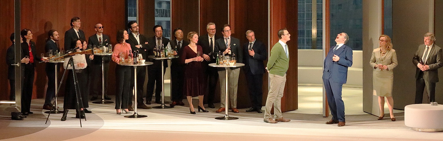 Tcherniakov kann mit diesem ganzen deutschen romantischen „Gedöns“ nichts anfangen. Für ihn sind die Protagonisten Menschen, die mit ihren inneren Dämonen kämpfen und in einer elitären, auf Erfolg und Business getrimmten Gesellschaft zu überleben versuchen. Und so stand mehr das Drehbuch für einen amerikanischen oder russischen Wirtschaftskrimi Pate für die Inszenierung, mit einigen cineastischen Effekten, wie man sie heute zu dutzenden in diversen Netflix-Produktionen zu sehen bekommt. Die Handlung spielt innerhalb von 24 Stunden, was dem Zuschauer durch diverse Zeiteinblendungen angezeigt wird. Das Bühnenbild, für das Tcherniakov ebenfalls verantwortlich ist, könnte ein Hotel- oder Bühnenfoyer mit dem Charme der Siebziger Jahre sein, mit großen schweren Holzdrehtüren, die bei Öffnung den Ausblick auf moderne Hochhäuser mit Glasfassaden eröffnet. Drei Sitzgelegenheiten, ein paar Bistrotische, Bierflaschen, das ist alles.