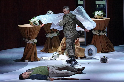 Völlig grotesk ist dann der Schluss. Max soll nun den offiziellen Probeschuss abliefern, Agathe erscheint viel zu früh mit den Worten „Schieß nicht“, und im für den Zuschauer eingeblendeten Visier sieht man Agathe, die getroffen wird. Doch Kaspar sinkt zusammen, und die große Finalszene mit dem Eremiten wird ad absurdum geführt, der „Heilige Mann“ ist einer der Bediensteten, die meist auch Corona-konform mit schwarzem Mund-Nasen-Schutz zum weißen Dinnerjacket auftreten. Wenn der Eremit vom Probejahr für Max und Agathe singt, bricht Max so lautstark in einen Weinkrampf aus, dass der Gesang des Eremiten dabei völlig in den Hintergrund gerät. Zum Schluss gibt es dann noch einmal einen Realitätenwechsel. Als das Licht wieder angeht, liegt Agathe tot auf dem Boden, erschossen von Max. So endet eine Inszenierung, deren Handlung mehr an einen schlecht gemachten Krimi erinnert als an eine sinnstiftende Inszenierung. Lediglich die Szene, in der Kaspar sich mit seinem inneren Dämon Samiel auseinandersetzt, hat Format, alles andere gerät zweitklassig und entspricht nicht dem Niveau, das man von einem Haus wie der Bayerischen Staatsoper erwarten darf.