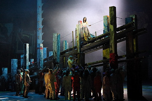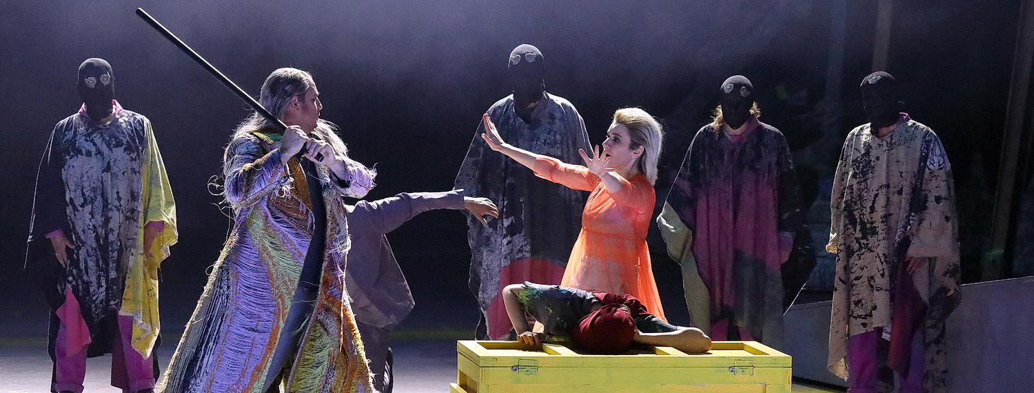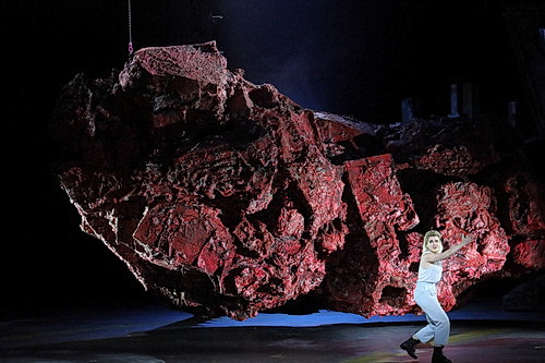 Im Mittelpunkt dieser Inszenierung von Antú Romero Nunes steht der Vater-Sohn-Konflikt und die seelischen Qualen, die beide aushalten müssen. Idomeneo einerseits, der seine Herrschaft nicht abgeben und sein Leben nicht verlieren, aber dafür seinen Sohn auch nicht opfern will, und auf der anderen Seite Idamante, der das abweisende Verhalten seines Vaters nicht versteht und auch lange braucht, um sich seine Liebe zu Ilia einzugestehen. Die Konstellation wird von Nunes sauber herausgearbeitet, ohne dabei in tiefenpsychologische Abgründe zu stürzen. Vieles in der Inszenierung ist auf Effekte aufgebaut, die die Dramaturgie des Werkes unterstreichen sollen. Da kommen Feuer und Windmaschinen zum Einsatz, die beeindruckende Lichtregie von Michael Bauer verstärkt die Effekte, die mit an Seilen durch die Luft fliegenden Statisten einen besonderen Augenschmaus bieten. Doch es ist nicht um des Effektes willen, sondern um die ganze Spannung und Dramatik dieser zwischenmenschlichen Tragödie zu beleuchten. Im Mittelpunkt der Inszenierung steht auch das Bühnenbild von Phyllida Barlow. Spätestens seitdem sie auf der Biennale von Venedig den Britischen Pavillon gestaltete, zählt die Bildhauerin zu den renommiertesten Künstlern der Gegenwart. Ihre monumentalen Skulpturen aus groben Alltagsmaterialien scheinen einem Zwischenraum zwischen Zivilisation und Natur entsprungen und erzählen gleichzeitig von Zerstörung wie von der Utopie des Neuanfangs. So erscheint es nur folgerichtig, dass sie nun ausgerechnet für Idomeneo erstmals das Bühnenbild einer Opernproduktion entworfen hat. Inspirieren ließ sich die an der britischen Nordküste aufgewachsene Künstlerin dazu von Objekten, in denen sich das Ringen der Küstenbewohner mit dem Meer widerspiegeln: Von Wellenbrechern, die die Gewalt der Wellen abwehren sollen, und von Aussichtsposten, die gewissermaßen einen Blick in die Zukunft ermöglichen, aber auch von Felsbrocken, in denen sich die Beständigkeit von Jahrmillionen mit der Gefahr des Unglücks verbindet. Zu Beginn der Aufführung wird der Hintergrund zunächst von einem blutroten Felsbrocken eingenommen, der sich aber bald auf Stelzen erhebt und dann wie eine warnende Gewitterwolke am Firmament lauert. Neben diesem Felsbrocken ist es ein fahrbarer Steg, der wie ein Wellenbrecher die Kräfte des Meeres abhalten soll. Dann gibt es bunte Türme, die wie Hochsitze Sichtschutz und Perspektive gleichzeitig verleihen, die den an Seilen gesicherten Protagonisten auch einiges an Schwindelfreiheit und Trittsicherheit abverlangen. Die Kostüme von Victoria Behr sind zeitlos, bunt und ordnen sich in das gesamte Setting harmonisch ein. Nicht unerwähnt bleiben sollen Statisterie und Staatsballett, die teilweise zirkusreife Luftakrobatik mit Zeitlupenläufen präsentieren und das große Finale tanzen, stimmig choreografiert von Dustin Klein.