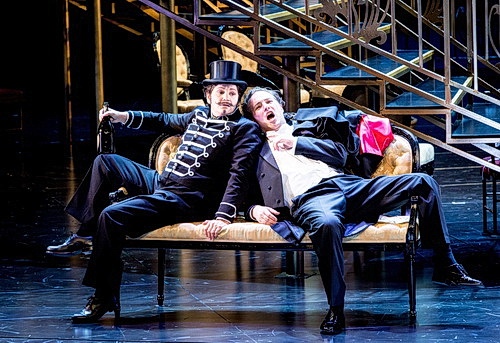 Es ist aber nicht nur eine grandiose Inszenierung, sondern auch musikalisch und sängerisch ist es ein großartiger Abend. Camille Schnoor gibt die Hanna Glawari mit großer Eleganz und Grandezza. In den dramatischen Höhen ist das Vibrato etwas scharf, dafür überzeugen ihre Piano-Töne. Und ihre Stimme besitzt einen schmeichelnden Liebreiz, der vor allem im Liebesduett Lippen schweigen für vokales Schmachten sorgt und zum musikalischen Höhepunkt des Abends geriert. Das Vilja-Lied singt sie innig, den letzten hohen Ton hält sie im zarten piano aus. Daniel Prohaska ist ein eher untypischer Danilowitsch. Wild, draufgängerisch, ohne Zylinder und Seidenschal, aber voller Leidenschaft. Sein „da geh ich zu Maxim …“ ist die Lebensphilosophie eines von der Liebe gekränkten Einzelgängers, der seine verletzten Gefühle musikalisch zum Ausdruck bringt. Er ist der einsame Wolf, auf der Suche nach Liebe und Anerkennung. Sein markanter Tenor mit baritonalem Timbre hat eine wunderschöne warme Mittellage, die Höhen sind kraftvoll und mit großer Souveränität im Ausdruck. Hans Gröning gibt den Baron Mirko Zeta mit trotteligem, aber liebenswürdigem Habitus. Sophie Mitterhuber als kokette Valencienne begeistert mit ihrem klaren und ausdrucksstarken Sopran und gibt an diesem Abend sängerisch und spielerisch, vor allem auch als Grisette im dritten Akt, eine überzeugende Performance. Lucian Krasznec überzeugt als Camille de Rosillon mit schönem Belcanto-Gesang und tenoralem Schmelz, als sei er grade einer Puccini-Oper entsprungen, auch wenn er bei seiner großen Arie für einen kurzen Moment Schwierigkeiten hat, den hohen Ton im Piano zu halten.