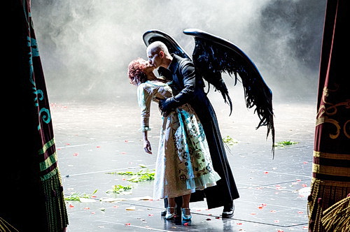 Die Szene im Maxim‘s ist klassisch dargestellt, die Grisetten tanzen lasziv erotisch, und Köpplinger wäre nicht Köpplinger, wenn unter den Grisetten nicht auch ein paar Männer wären. Einfach schön gemacht. Am Ende löst sich scheinbar alles in Wohlgefallen auf, Hanna und Danilo finden endlich zusammen, die Millionen bleiben im Lande. Aber Köpplinger verzichtet an dieser Stelle auf die typische Operettenseligkeit und Heiterkeit und holt das Publikum zurück in eine düstere Realität. Njegus tritt nach vorne, und berichtet mit Grabesstimme, dass der Thronfolger ermordet wurde und Krieg herrsche. Zuerst treten die Männer, fast alle in Uniform, ab. Die Pflicht am Vaterland ruft, und keiner wird zurückkommen. Dann treten auch die Frauen schweigend ab, wissend, dass sie ihre Männer nicht wiedersehen werden. Hanna Glawari bleibt ganz allein zurück auf der Bühne. Da erscheint der Tod mit großen, schwarzen Flügeln, packt sich die Witwe und küsst sie. Es ist der Kuss des Todes, am Ende hat der Tod gesiegt. Es ist ein hoch emotionaler und bewegender Moment, der zu einem intensiven Moment der Stille im Publikum führt, der kaum auszuhalten ist. Dann bricht der Jubel los.