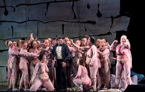 Großartig die von Stellario Fagone einstudierten Chöre der Bayerischen Staatsoper. Marek Janowski, kurzfristig für Mikko Franck eingesprungen, leitet das Bayerische Staatsorchester mit großem Gefühl und lässt durch sein unprätentiöses Dirigat wunderbare Phrasierungen und Akzentuierungen zu. Das Vorspiel hat schon fast sakralen Charakter, das Tempo ist moderat, aber niemals hastig. Beeindruckend seine präzisen Einsätze, die das Gesamtensemble aus Musikern, Solisten und Chor zu einer homogenen Gestaltung führt, dabei hat er immer einen Blick für den Sänger, der für ihn im Vordergrund steht und dem er das Orchester unterordnet. Ein insgesamt ergreifendes musikalisches Klangerlebnis, das der mittlerweile 83-jährige Altmeister aus dem Orchestergraben zaubert.