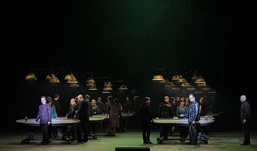 Anders die Gräfin, großartig von der Grand Dame Violeta Urmana verkörpert. Sie ist von einer schweren Krankheit gezeichnet, unter der Perücke eine Glatze. In Hermanns Visionen treten im vierten Bild fünf Doubles unter­schied­lichen Alters von ihr auf. Sie ist die dominie­rende Persön­lichkeit, nicht nur, weil sie das Wissen um die Macht der Karten besitzt. Man sieht zudem einen fußtiefen Wasserpool auf der Bühne, in dem Hermann eines der Doubles der Gräfin ertränkt, aus der Vogel­per­spektive durch einen Hohlspiegel unterhalb der Bühnen­decke gut zu beobachten. Zuvor spielte sich die Ballszene im dritten Bild auf einer fahrbaren Tribüne ab, auf der Chor und alle Protago­nisten, teilweise mit Gesichts­masken, sitzen und einer simplen und nichts­sa­genden Choreo­grafie von Klevis Elmazaj folgen.