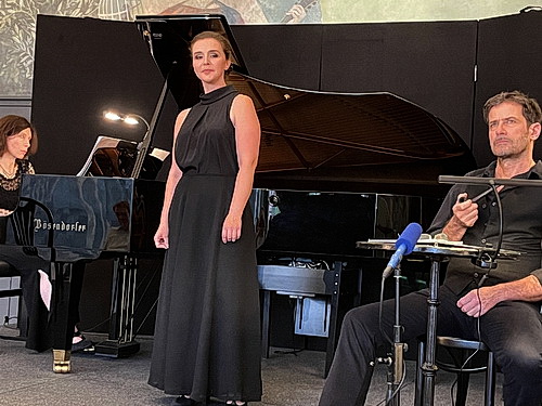 Die hoch emotionale Geschichte wird wunderbar bewegend von dem Schauspieler Andreas Zimmermann gelesen. Doch es ist nicht nur eine einfache Rezitation, sondern es ist eine Interaktion mit den anderen Künstlern, allen voran mit der Mezzosopranistin Anna-Katharina Tonauer. Seit sechs Jahren gehört sie zum Ensemble des Gärtnerplatztheaters mit einem umfangreichen Repertoire in ihrem Fach. An diesem Abend kann sie eine ganz andere Facette ihres umfangreichen Könnens zeigen. Das Kunstlied, aber nicht einfach nur schön gesungen, sondern mit viel Ausdruck, Gestik und Mimik. Die Attribute „stolz, stark und frei“ verkörpert Tonauer mit jeder Faser ihres Körpers und mit jeder Phrasierung. Schon ihr erster Auftritt beim Betreten der Bühne, begleitet von Ekaterina Tarnopolskaja mit dem Lied Die drei Zigeuner von Franz Liszt macht deutlich, dass sie die Lieder, die sie singt, förmlich lebt. Tonauer singt das und die folgenden Lieder mit großem Ausdruck und klarer Textverständlichkeit. Ihre Phrasierungen variieren von zarter Lyrik bis hin zu feuriger Dramatik, von süßer Melancholie bis hin zu stählerner Stärke. Und dann beginnt die Lesung von Andreas Zimmermann, der von Tonauer förmlich taxiert wird. Schnell ist klar, Tonauer verkörpert die beiden Frauengestalten Nonka und Radda in der Erzählung Makar Tschudra. Die Sapphische Ode op. 94, Nr. von Johannes Brahms interpretiert sie sehr lyrisch, ja, schon ein wenig wehmütig, mit zarter Pianobegleitung. Und dann der nächste Teil der Lesung, mit aufbauender Spannung und großartiger Interaktion von Zimmermann und Tonauer, die mit ihren Blicken auch das Publikum einbeziehen. Dann singt sie die ersten acht von den elf Zigeunerliedern op. 103 von Johannes Brahms.