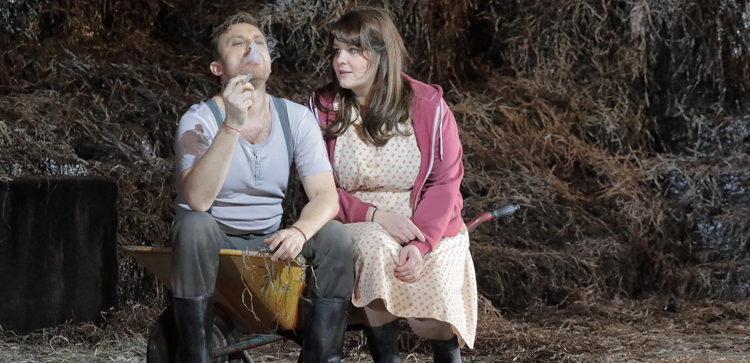 Ein mächtiger Misthaufen dominiert das Bühnenbild. Er dampft ständig vor sich hin. Allerlei landwirtschaftliches Gerät wie ein fahrbarer Traktor, Förderbänder, Schubkarren, aber auch ein dreckiges Dixie-Klohäusel vervollständigen die Szenerie, die von Patrick Bannwart stammt. Und er bietet allerlei vulgären Spießgesellen, Mädchen in Hotpants aber auch Dorfrockern, die zu Smetanas Tanzrhythmen headbangen, in verschiedenen Etagen viele vitale Auftrittsmöglichkeiten: Voll prallem, volkstümlichem, manchmal überdrehtem Realismus, bäuerlich derb, aber auch ungemein ideenreich und voller kleinster Details auch auf den Nebenschauplätzen ist die Inszenierung von David Bösch bei Bedřich Smetanas Die Verkaufte Braut an der Bayrischen Staatsoper in München. Und der Regisseur, der am Nationaltheater schon mehrfach inszeniert hat, ist auch als Pointen-Lieferant versiert. Das geht vom Pseudo-Spektakel der Zirkustruppe, die einem Halloween-Albtraum entsprungen ist, bis zum ständig einbezogenen Souffleur. Einen tieferen, dramaturgischen Bogen bleibt er allerdings schuldig.