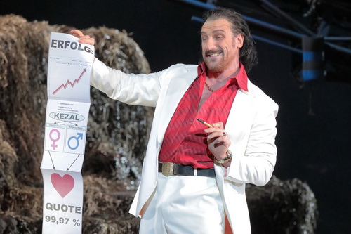 Eine Urgewalt auf der Bühne ist Günther Groissböck, derzeit hauptsächlich im Wagner- und Strauss-Fach gebucht, als ungemein präsenter, geschwätziger Heiratsvermittler Kezal mit exakt fokussiertem, profundem Bass, selbst bei seinen Klimmzügen und beim Armdrücken. Er ist ein schmieriger, überheblicher Macho im weißen Strizzi-Anzug, mit Goldkettchen, goldener Armbanduhr, Klapphandy und rotem, bis zum Gürtel aufgeknöpften Hemd. Und er wirbt schon während der Ouvertüre und auch später immer wieder mit projizierten Inserts in mehreren Sprachen für „Bräute und Versicherungen – mit einer Erfolgsquote von 99,97 Prozent“. Bei seiner Diktion bräuchte es denn auch keine Übertitel, zumal sich Dirigent Hanus für Max Kalbecks deutsche Fassung der 1866 in Prag uraufgeführten Nationaloper entschieden hat.