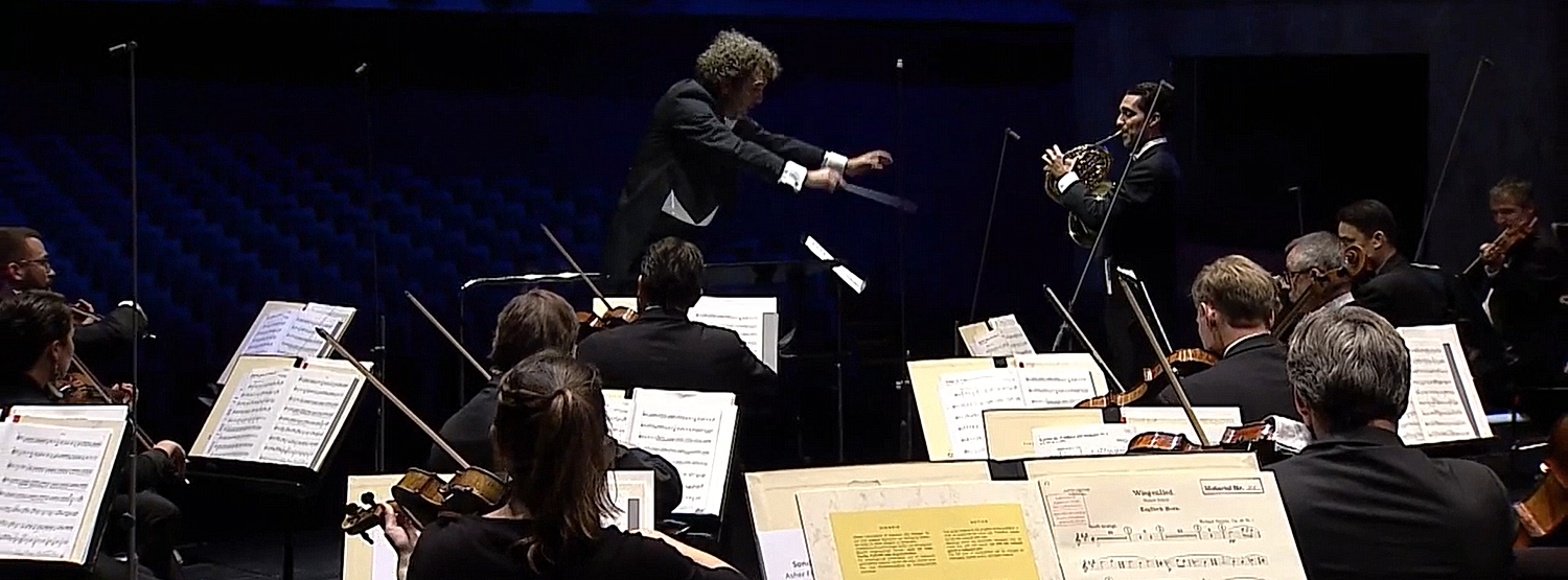 Im Rahmen ihrer Reihe Montagsstücke setzte die Bayerische Staatsoper München ihre live im Stream übertragenen Konzerte fort. Unter dem Titel Zueignung gab es ein Sonderkonzert Richard Strauss. Dieser Livemitschnitt ohne Publikum, ohne Applaus, war sicher ein Konzert der etwas anderen Art. Während sich zum ersten Stück das Licht im Haus in ein dunkles Blau färbte, stand auf dem Programm das Hornkonzert Nr. 1 in Es-Dur, op. 11. Der erst 18-jährige Richard Strauss widmete es „Seinem lieben Vater, Herrn Franz Strauß, Königlich-Bayerischer Kammermusiker“ zum 60. Geburtstag. Franz Strauss war ein bekannter Hornist und Mitglied des Münchner Hofopernorchesters. Parallel zur Erstfassung mit Klavierbegleitung entstand im Winter 1882⁄83 auch eine Version für Horn und Orchester, gewidmet dem damaligen Solohornisten der Königlich-Sächsischen Hofkapelle Dresden, Oscar Franz. In der Orchesterfassung wurde das 1. Hornkonzert am 4. März 1885 im Rahmen eines Konzerts in Meiningen mit der Meininger Hofkapelle unter der Leitung Hans von Bülows und dem Solisten Gustav Leinhos uraufgeführt. Musikalisch besteht dieses 1. Hornkonzert aus 3 Sätzen, die aber unmittelbar ineinander übergehen. Asher Fisch am Pult des Bayerischen Staatsorchesters und der Hornist Johannes Dengler spielen dieses so heitere und beschwingte Konzert im moderaten Tempo und mit viel Esprit. Die schwierigen Hornsolostellen meistert Dengler sauber und mit Bravour. Nach 16 Minuten Konzert hätten Dengler und das Orchester einen großen Applaus verdient, der blieb natürlich mangels Publikum aus, dagegen eher eine beklemmende Stille, was das Gefühl vermittelte, irgendetwas fehlte.