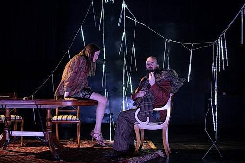 Boris C. Motzki versucht, das Stück so zu inszenieren, dass es der „Tagesschau-Anmutung“ entkommt. Er steckt es in die Klammer eines Chorgesangs, der a cappella zu Beginn und zum Ende der Aufführung von den Akteuren vorgetragen wird. Domani è un altro giorno – Morgen ist ein anderer Tag – hat Giorgio Calabrese für Ornella Vanoni verfasst, die es 1972 zum ersten Mal sang und daraus neben L’apuntamento einen ihrer größten Erfolge machte. In der choralen Fassung entwickelt das Lied noch einmal eine völlig neue Wirkung und fügt sich gut in die Unwissenheit des Stücks ein, was am Ende des Tages gültig ist. Stehen die Darsteller dazu in einer Reihe „an der Rampe“, hat ihnen Miriam Busch dahinter mit Vintage eine schöne Spielfläche gebaut. Teppiche bedecken den Boden, auf dem im Mittelpunkt ein antiker Esstisch aufgebaut ist. Rechts steht ein alter Ohrensessel mit einer Stehlampe. Später wird der zunächst verhängte Hintergrund geöffnet und bietet zusätzliche Sitzgelegenheiten. Zusätzlich gibt es Leuchtelemente, die quer durch den Raum hängen. Dass die Bühne im Laufe der Ereignisse fast vollständig geräumt wird, ist womöglich der plakative Ausdruck dessen, dass das Alte Platz machen für Neues, von dem niemand weiß, was es ein wird. Für die Darsteller hat Busch ziemlich schräge Kostüme gefunden, frei nach dem Motto: Hauptsache Muster. Das Licht setzt Motzki hauptsächlich für Ebenenwechsel ein, wenn er in Einspielungen Musik oder Sprechchöre laut werden lässt.