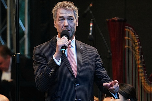 Die Musiker der Deutschen Kammerakademie Neuss betreten in großer Besetzung pünktlich die Bühne, und so kann das Ereignis auch kurz nach 21 Uhr beginnen. Auch in diesem Jahr übernimmt Daniel Finkernagel die Moderation. Wie immer bestens präpariert, neigt der Moderator in diesem Jahr eindeutig zur Langatmigkeit. Mögen die Versuche als Animateur noch angehen, wird es bedenklich, wenn der Sprecher auf der Bühne sich selbst gern reden hört. Und Finkernagel mag offenbar sehr, was er von sich hört. Da gibt es durchaus originelle Einfälle, wenn er etwa über die Entstehung Europas oder über den Haschisch-Konsum von Richard Wagner erzählt, allein in der Hälfte der Zeit genügte es auch. Denn hier gilt es nicht, schlechte Musik durch lange Texte zu übertünchen. Ganz im Gegenteil.