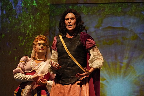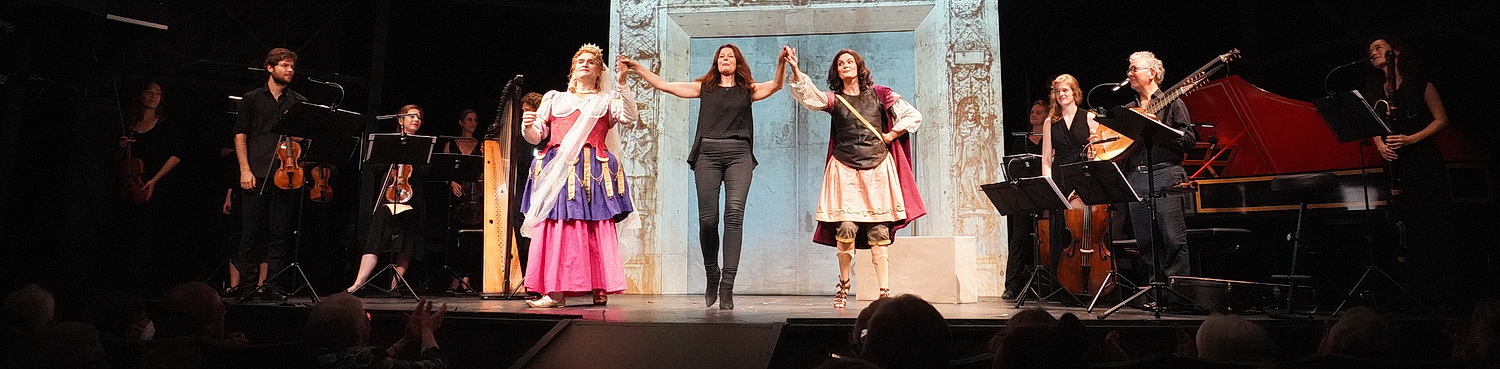 Adonis und Venus springen nicht über Felder und Bäche, sondern bewegen sich in typisch barocken Manierismen. Und das ist in der Tat, um auf Rainer Wiertz zurückzukommen, großartig. Schon bald fühlt man sich um Jahrhunderte zurückversetzt, überlegt, ob die Vorstellung nicht sogar besser im angrenzenden Führring hätte stattfinden sollen. Aber dann wäre die trockene Akustik verloren gewesen. Stattdessen spielt Torge Møller naturalistische Videobilder ein, eigentlich ein Unding. Eine Baumlandschaft, ein künstlicher Wasserfall, eine Grotte. So was geht doch heute nicht mehr. Doch. Und Johannes Ritter fügt mit Kostüm und Maske einen weiteren Baustein der Vergangenheit hinzu. Seit jeher ist es das Wesen des Theaters, dass Menschen die Rollen spielen, die ihnen am weitesten entfernt sind. Also kleidet Ritter Sabata als Venus ein, mit einer Maske, die sie als königliche Fregatte darstellt, und Mameli als Adonis, dem nichts Weibliches anhaftet. Hier wird, wie in früheren Zeiten üblich, alles nur Mögliche auf den Kopf gestellt. Die Zeitreise ist perfekt, und es ist ein wahrhaft historisch informiertes Aufführungsfest.