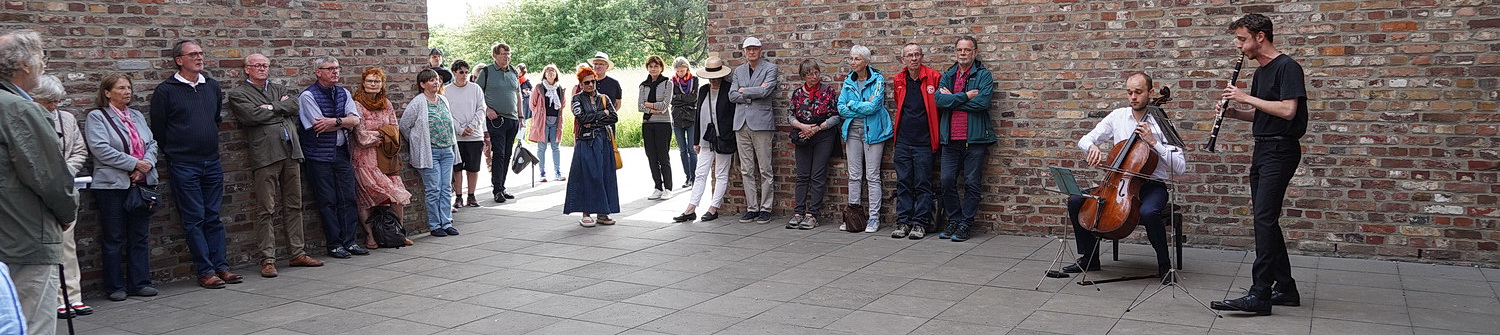 Um zur zweiten Station zu gelangen, geht es einen flachen Hügel hinauf zu einem Gebäude, das Erwin Heerich um die Jahrtausendwende geschaffen hat. Früher als Haus für Biophysik entstanden, bietet es heute Archiv und Bibliothek Raum. Der Würfel hat im unteren Teil zwei diagonale Aussparungen. Im Innenhof mit quadratischer Dachöffnung ergeben sich interessante Blickwinkel und Lichtspiele. Hier ziehen sich Leibovitz und Kułakowski in die windgeschützte Ecke zurück, um Rebecca Clarkes dreisätzige Hommage an die scheinbar vergangene Romantik aus dem Jahr 1941 aufzuführen. Ursprünglich für Bratsche und Klarinette geschrieben, hat Kułakowski den Viola-Part bei Prelude, Allegro und Pastorale für Cello eingerichtet. Großartige Musik. Ob man sie hier im Stehen und Durchzug so recht genießen kann, sei dahingestellt. Ob es am Alter der beiden Musiker oder dem auferlegten Schweigen liegt: Es will sich die richtige Atmosphäre nicht einstellen.