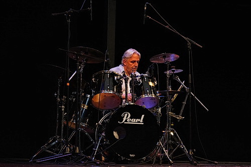 Weil der Schlagzeuger aus Argentinien nicht kommen kann, ist Vater Krum eingesprungen. Die 67 Jahre, die er bislang gelebt hat, sieht noch hört man ihm an. Oder vielleicht gerade. Mit viel Erfahrung bedient er das Schlagwerk, zeigt ein feines Gefühl für die notwendige Untermalung. Vom harten Rhythmus bis zur feinfühligen Behandlung der Klangschalen beherrscht er das Portfolio. Unterstützt werden die beiden vom E‑Gitarristen Tobias Kemper, der mit einigen Soli glänzt.
