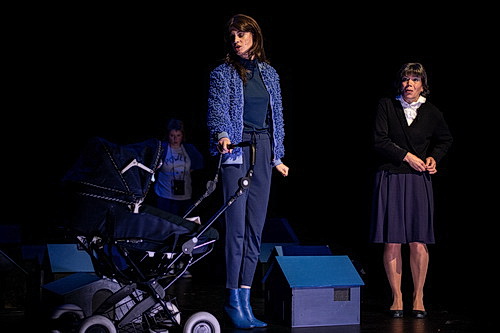 Es gibt eine Menge Sollbruchstellen, an denen aus der Geschichte Horror, ein kritischer Gesellschaftsroman oder gar eine Parabel hätte werden können. Nichts dergleichen geschieht. Die Handlung bleibt so platt, wie sie ist. Daran ändern auch Bühnenbild und Kostüme von Anike Sedello nichts. Ihr Faible für Blautöne steht im Gegensatz zur Symbolik des Abends. Von Hoffnung ist nichts zu spüren. Das Bühnenbild mit seinen Miniaturhäusern, die erst in Dorfform, später als „Trutzburg“ im Wald, der aus heruntergelassenen, baumähnlichen Gegenständen besteht, erschwert die Vorstellung, dass es sich bei diesem Stück um Theater für Erwachsene handelt.